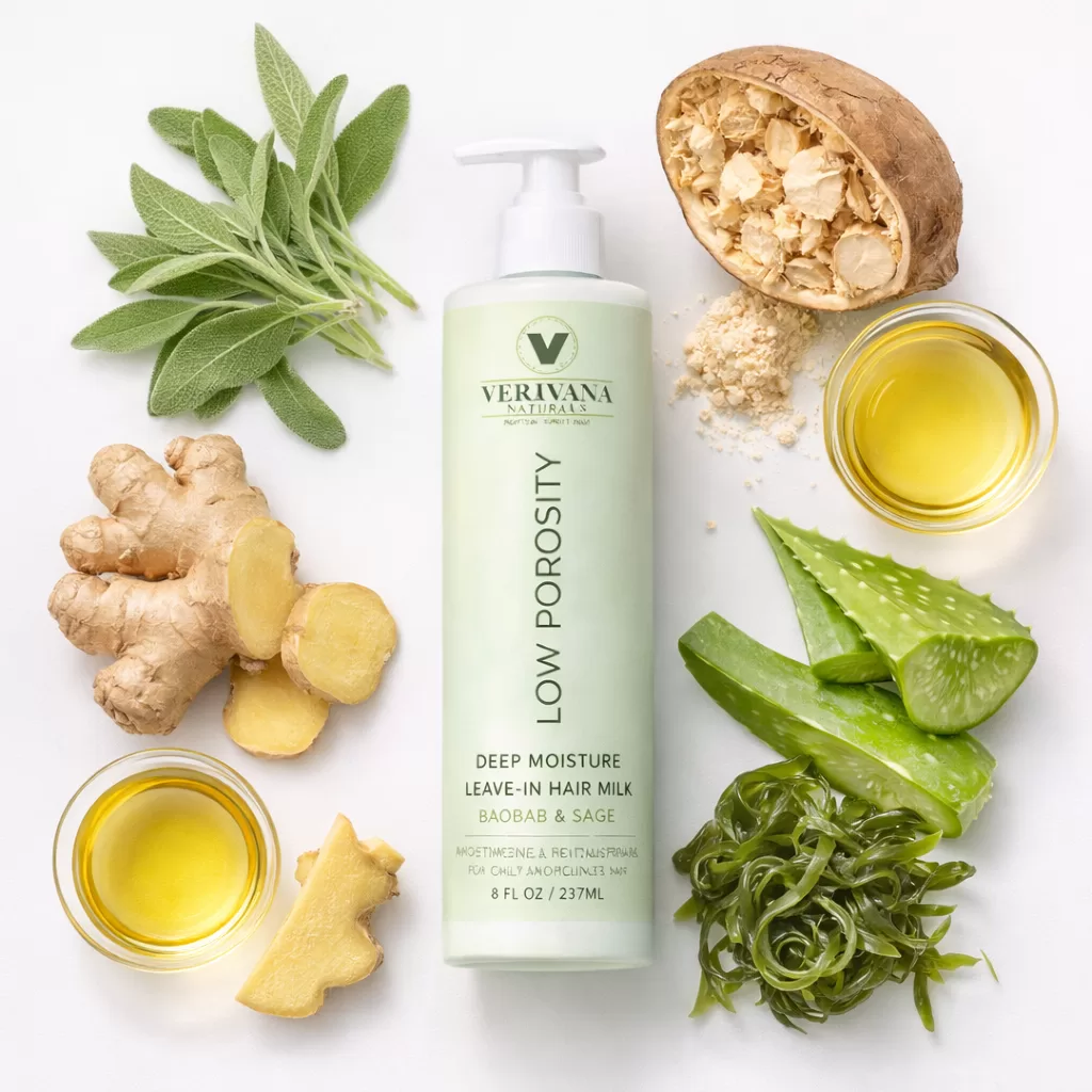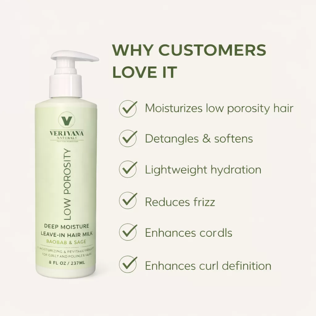 Deeply hydrate moisture-resistant strands with Vertvana Naturals Low Porosity Deep Moisture Leave-In Hair Milk. This lightweight conditioning formula is specially designed for low porosity curls, coils, and waves that struggle to absorb moisture. Infused with Baobab Oil and Sage Extract, it helps soften hair, reduce frizz, improve curl definition, and restore long-lasting hydration without heavy buildup. Perfect for daily moisture, detangling, and maintaining healthy, manageable curls.